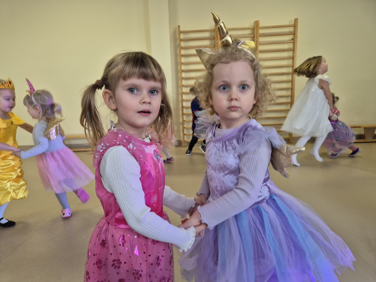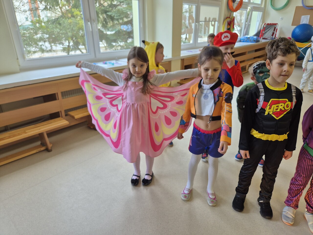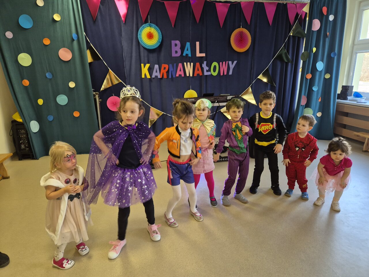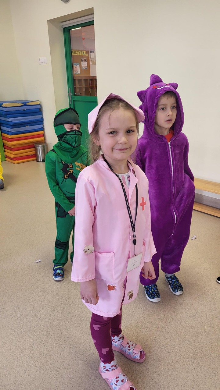 W naszym przedszkolu odbył się Bal Karnawałowy. Tego dnia sala zamieniła się w kolorową, roztańczoną krainę pełną świateł, muzyki i radości. Dzieci w przepięknych, bajkowych strojach z ogromnym entuzjazmem uczestniczyły w zabawach i konkursach, a parkiet ani przez chwilę nie był pusty. Wspólne tańce przy ulubionej muzyce sprawiły wszystkim mnóstwo radości. Dodatkową atrakcją były efekty świetlne, delikatny dym oraz unoszące się w powietrzu bańki mydlane, które wywoływały zachwyt i szerokie uśmiechy.