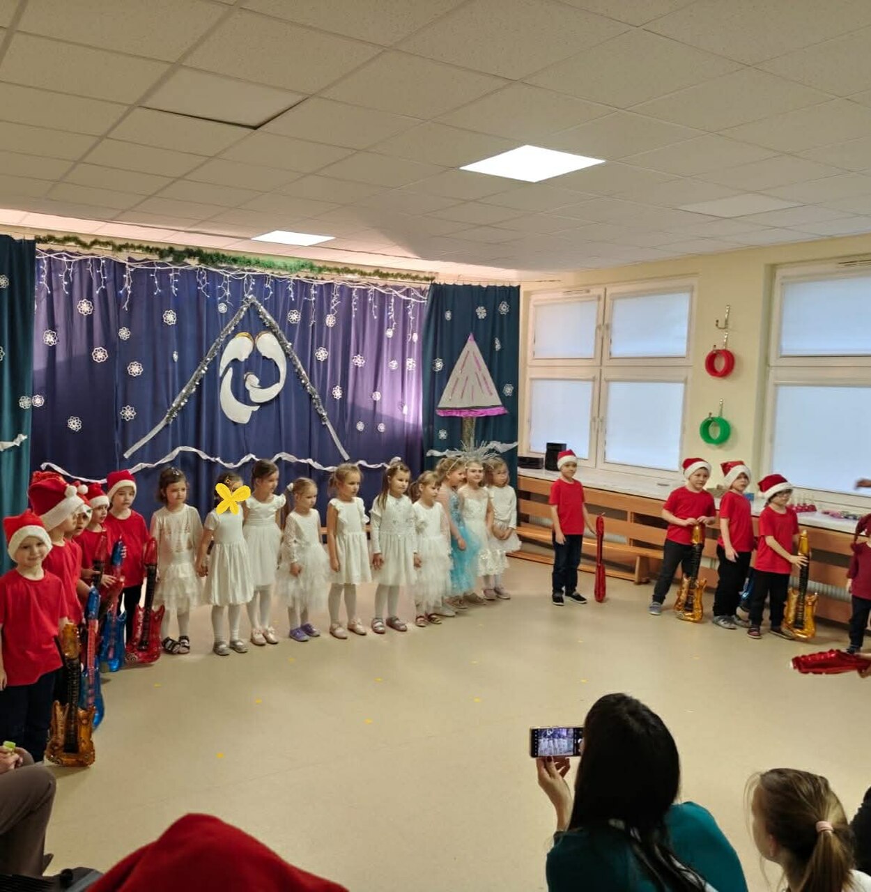 W naszym przedszkolu odbyło się radosne spotkanie choinkowe z udziałem rodziców. Dzieci zaprezentowały świąteczne wiersze, piosenki oraz tańce, wprowadzając wszystkich w wyjątkowy, bożonarodzeniowy nastrój. Wspólne kolędowanie i chwile spędzone razem stworzyły ciepłą, rodzinną atmosferę.